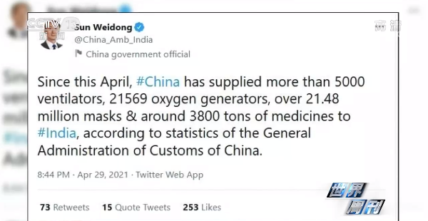 4月29日,中国驻印度大使孙卫东在推特中介绍了中国向印度提供抗疫物资的情况。