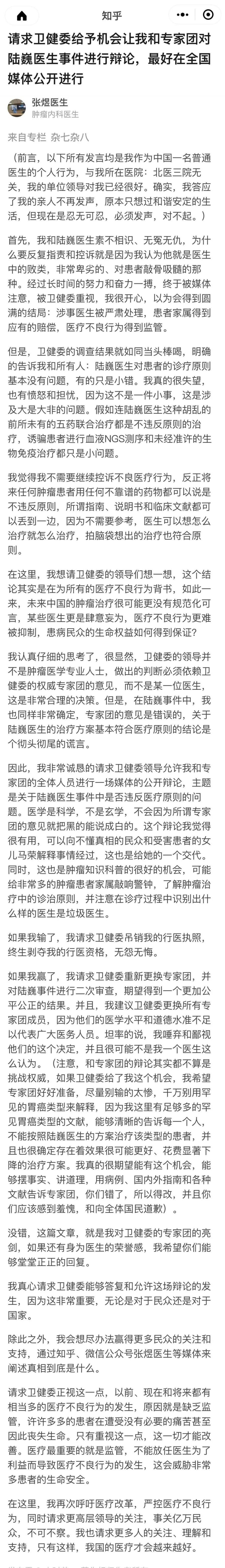 原标题《请求卫健委给予机会让我和专家团对陆巍医生事件进行辩论,最好在全国媒体公开进行》,作者:张煜医生