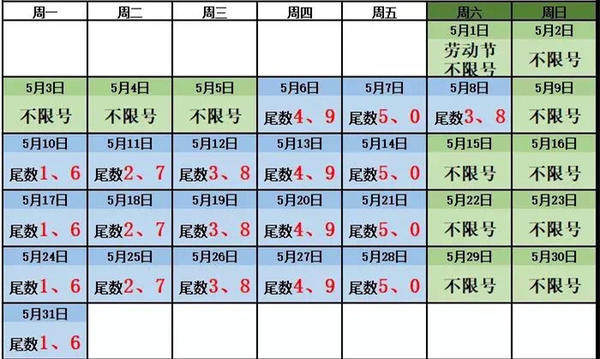 附:郑州5月份限行日历