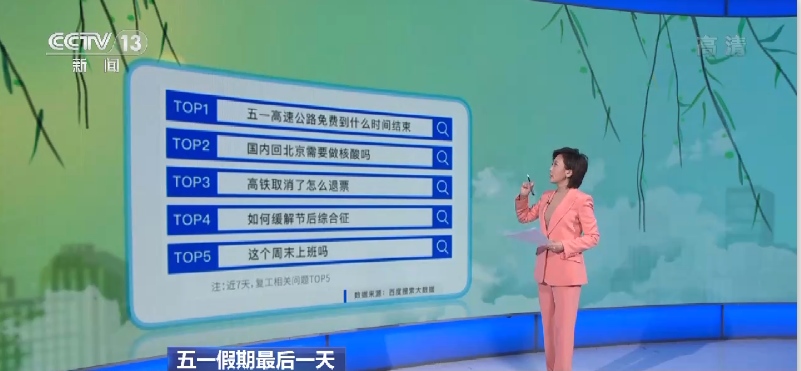 百度搜索显示,这些问题关注度最高:“五一高速公路免费到什么时间结束”“回北京需要做核酸吗”“怎么缓解节后综合征”等等。我们在这里可以告诉您,关于高速免费,结束的时间是5日夜里24点,低风险区是不需要做核酸的,但是14天内一定要多注意自己的身体变化,同时做好个人防护。