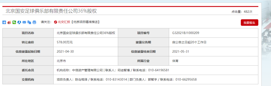 北京国安足球俱乐部36%股权被中信挂牌转让