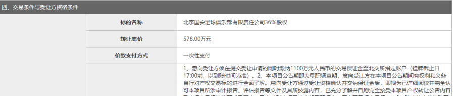 据北京产权交易所网站消息,北京国安足球俱乐部有限公司寻求转让36%股权,转让底价为578万元。