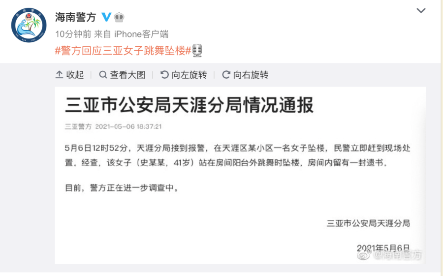 5月6日,三亚市公安局天涯分局发布情况通报:5月6日12时52分,天涯分局接到报警,在天涯区某小区一名女子坠楼,民警立即赶到现场处置。经查,该女子(史某某,41岁)站在房间阳台外跳舞时坠楼,房间内留有一封遗书。