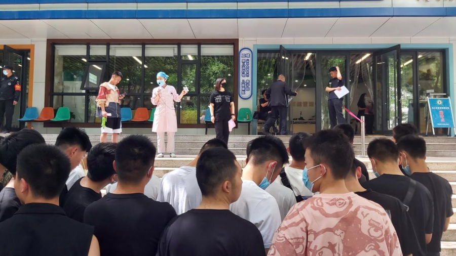 在南阳新村社区卫生服务中心儿童部接种点,面对众多青年学子,中心医务人员站在室外平台上,向大家讲解接种疫苗注意事项并对不符合接种条件的人员进行分流。