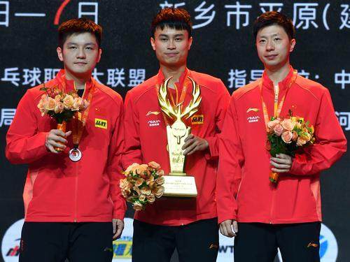 冠军周启豪(中)、亚军樊振东(左)与季军马龙在颁奖仪式上。