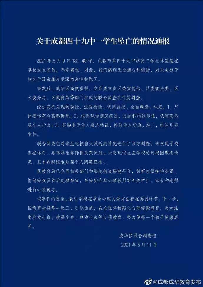 当天下午,四十九中作出回应,称学校已经报警,公安机关正开展调查。5月11日凌晨3点54分,成都成华区联合调查组发布了通报,称该坠亡事件,可排除刑事案件;经多方调查,未发现学校存在体罚、辱骂学生等师德失范问题,也未发现该生在学校受到校园欺凌的情况,基本判断是因个人问题轻生。