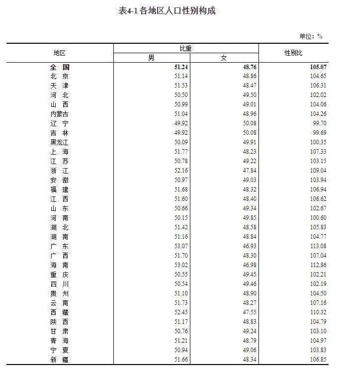 反观总人口性别比最高的3个省份,分别是广东(113.08)、海南(112.86)和西藏(110.32),都在110以上。