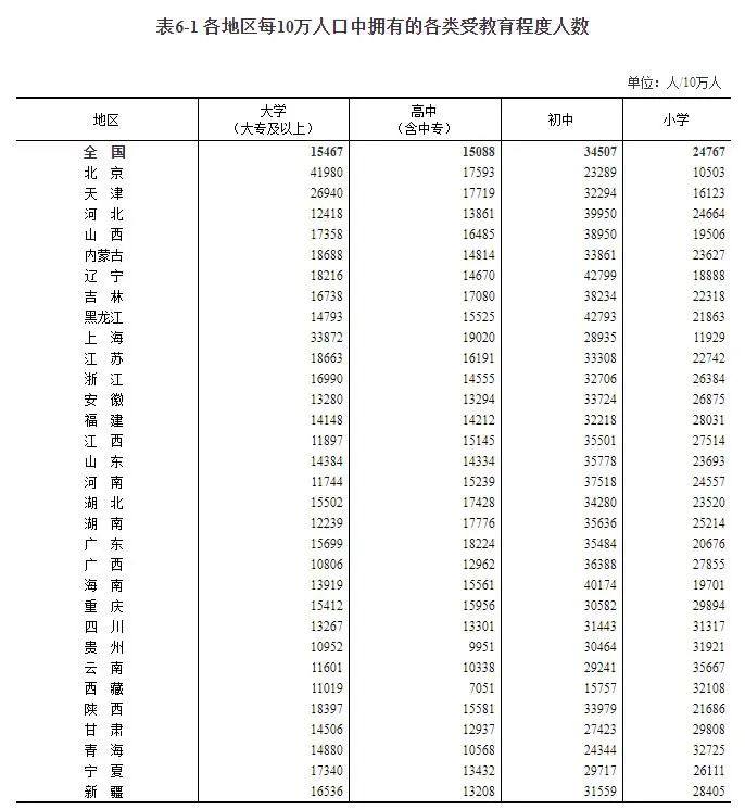 其中,北京每10万人中具有大学文化程度的为41980人,为全国最高;15岁及以上人口平均受教育年限12.64年,也是全国最高。