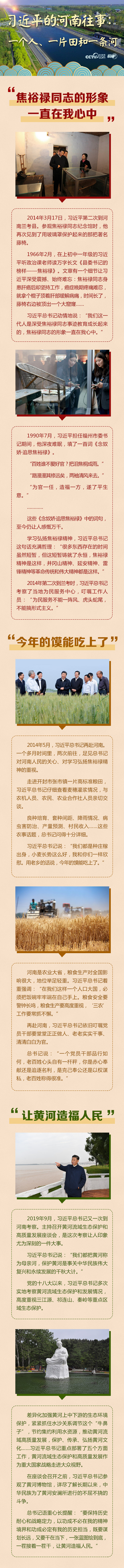 习近平总书记十分关心河南人民群众,曾多次到河南考察,留下许多让人印象深刻的往事。兰考县的好干部焦裕禄,开封市的高产小麦田,涓涓流淌的母亲河……这里的人、田和河,都如此令人难忘。