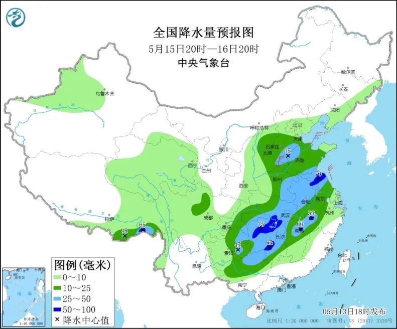 5月16日,冷空气的脚步继续向南迈进,将会给江苏北部、湖北东南部、湖南北部、江西北部等地部分地区有暴雨。到了5月17日,本次降水过程将趋于结束。