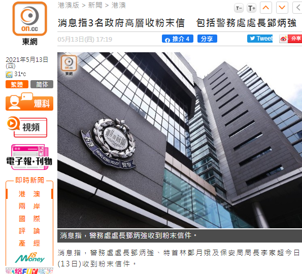 林郑月娥、邓炳强等收到粉末信件