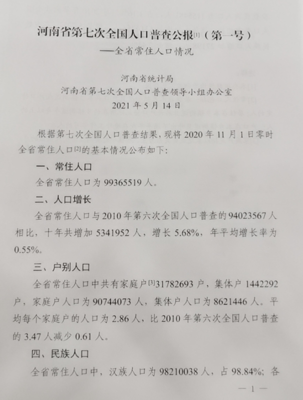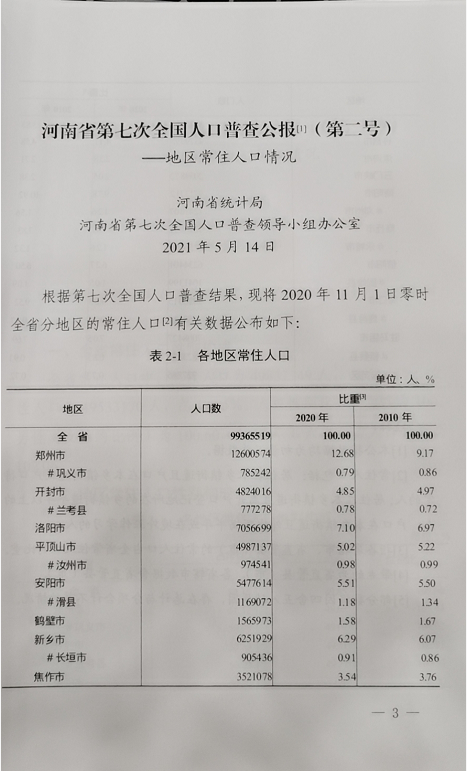 5月14日,省政府新闻办举行新闻发布会,公布我省第七次全国人口普查主要数据情况。记者在发布会现场获悉,截至2020年11月1日零时,全省常住人口共9936.6万人,占全国人口的7.04%,位居全国第三。与2010年第六次人口普查的9402.4万人相比,增加534.2万人,增长5.68%,年平均增长率为0.55%,比2000年到2010年的年平均增长率0.16%上升0.39个百分点。我省人口十年来继续保持平稳增长态势。