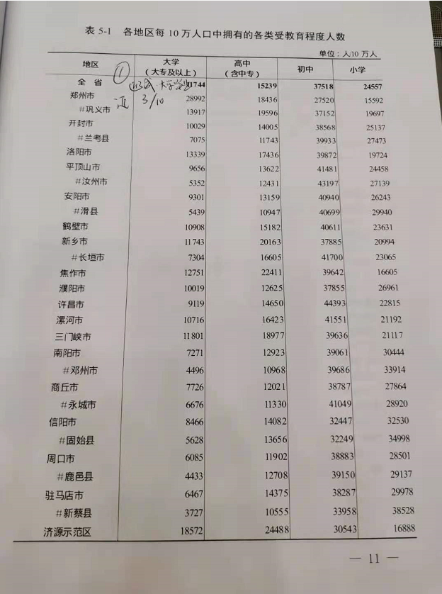(五)受教育程度。拥有大学(指大专及以上)文化程度的人口为1167.0万人,拥有高中(含中专)文化程度的人口为1514.2万人,拥有初中文化程度的人口为3728.0万人,拥有小学文化程度的人口为2440.1万人。与2010年相比,每10万人中拥有大学文化程度的由6398人上升为11744人,拥有高中文化程度的由13212人上升为15239人,拥有初中文化程度的由42460人下降为37518人,拥有小学文化程度的由24108人上升为24557人。15岁及以上平均受教育年限为9.79年,文盲率为2.24%,与2010年相比,分别增加了0.84年,下降了2.01个百分点。各种受教育程度的持续改善和文盲率的变化,反映了十年来我省发展教育事业,普及义务教育,扫除青壮年文盲等措施取得积极成效。