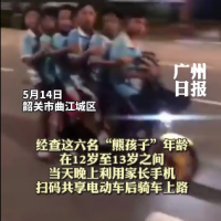 5月14日晚,韶关市曲江城区某路段有六名学生模样的儿童同骑一辆共享电动车的视频引发网友关注。经查,这六名“熊孩子”年龄在12岁至13岁之间,当天晚上利用家长手机扫码共享电动车后骑车上路。