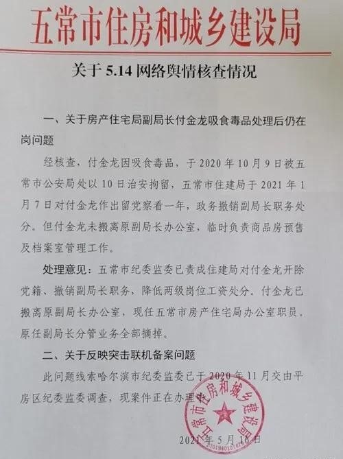 16日,五常市住建局公布处理结果。经核查,付金龙因吸食毒品,于2020年10月9日被五常市公安局治安拘留。2021年1月7日,五常市住建局对付金龙作出留党察看一年、撤销副局长职务处分。但付金龙未搬离原副局长办公室,临时负责商品房预售及档案管理工作。