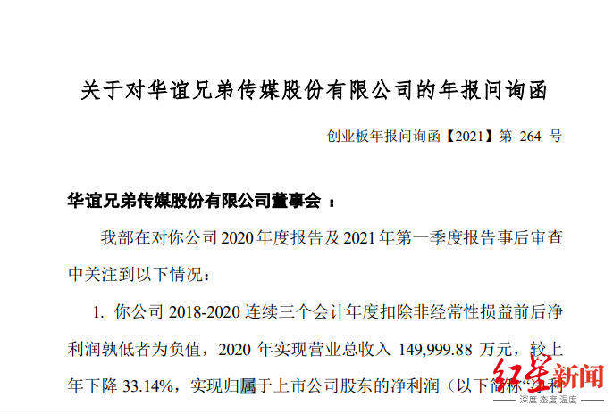 5月17日,据深交所网站消息:创业板公司管理部向华谊兄弟传媒股份有限公司的年报发布问询函。