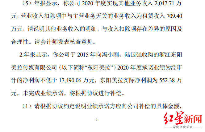 问询函显示,创业板公司管理部在对华谊兄弟2020年度报告及2021年第一季度报告事后审查中,关注到华谊兄弟于2015年向冯小刚、陆国强收购的浙江东阳美拉传媒有限公司2020年度承诺业绩为经审计的净利润不低于17,490.06万元,东阳美拉实际净利润为552.38万元,未完成业绩承诺,将根据协议进行补偿。