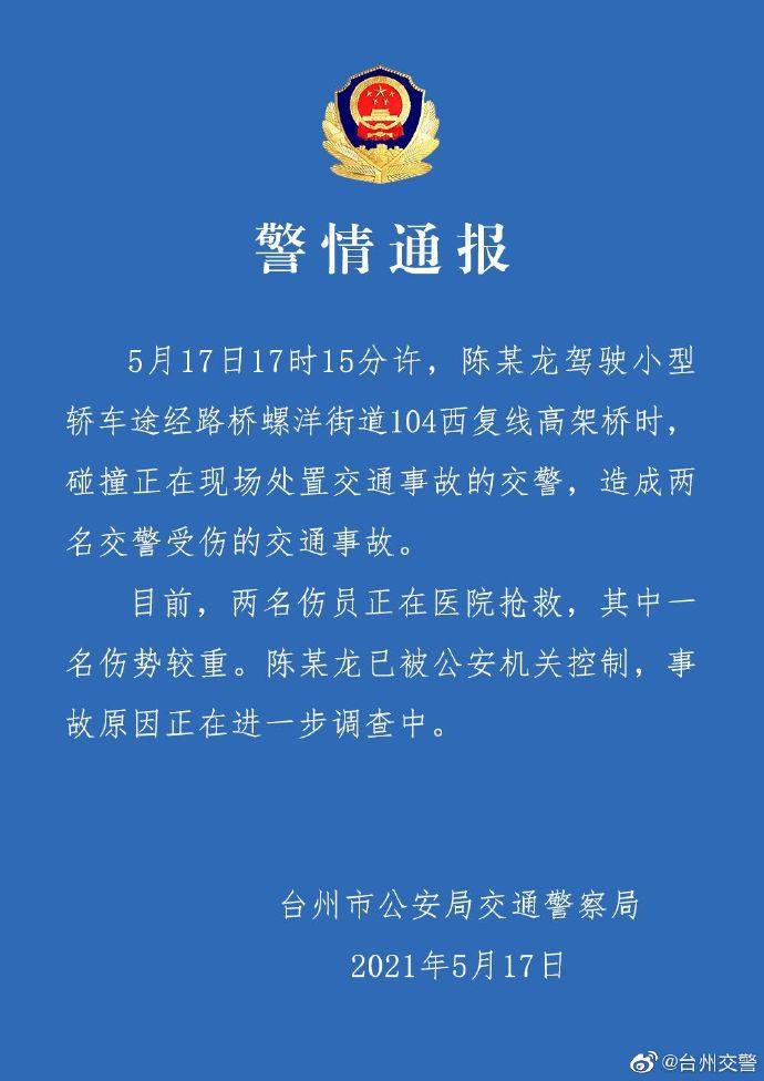 据@台州交警消息,5月17日17时15分,一辆小型轿车途经桥螺洋街道104西复线高架桥时,碰撞正在现场处置交通事故的交警,造成两名交警受伤。目前,两名伤员正在医院抢救,其中一名伤势较重。肇事司机已被公安机关控制,事故原因正在调查中。