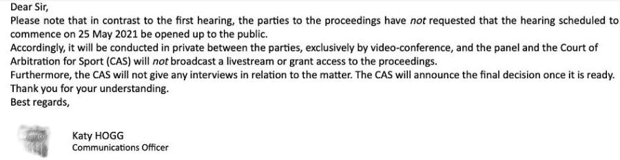 国际体育仲裁法庭表示,与第一次听证会不同,诉讼当事方没有要求将听证会向公众开放。因此,听证会将仅通过视频会议的形式不公开举行。国际体育仲裁法庭将不会接受任何采访,一旦做出裁决,国际体育仲裁法庭将直接宣布。