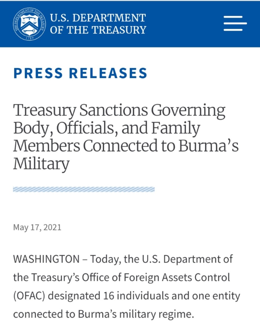 根据美国财政部官网上发布的最新文件,美国即日起对缅甸国家管理委员会这一政治实体以及该委员会下属的13名官员、3名官员子女实施制裁。美国财政部外国资产控制办公室(OFAC)主任加基(Andrea Gacki)表示:“本次制裁是根据拜登总统2月10日签发的14014号行政命令‘针对缅甸局势冻结相关资产’所作出的,旨在向缅甸军方施加压力,追究责任。”