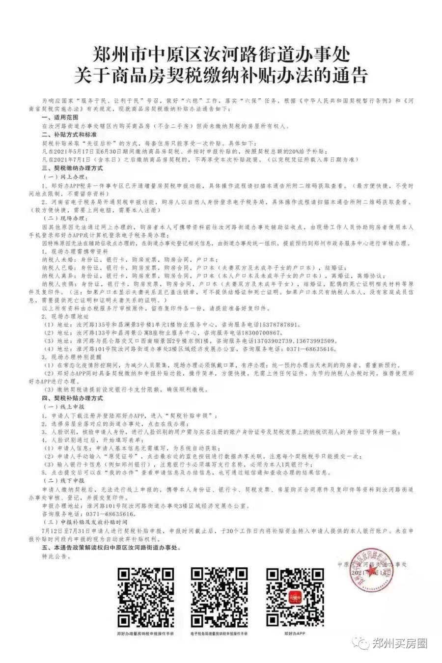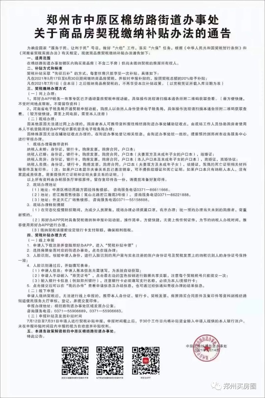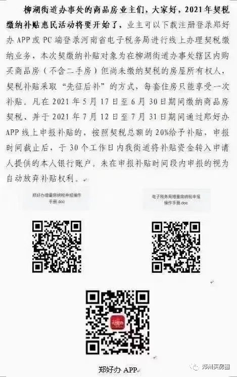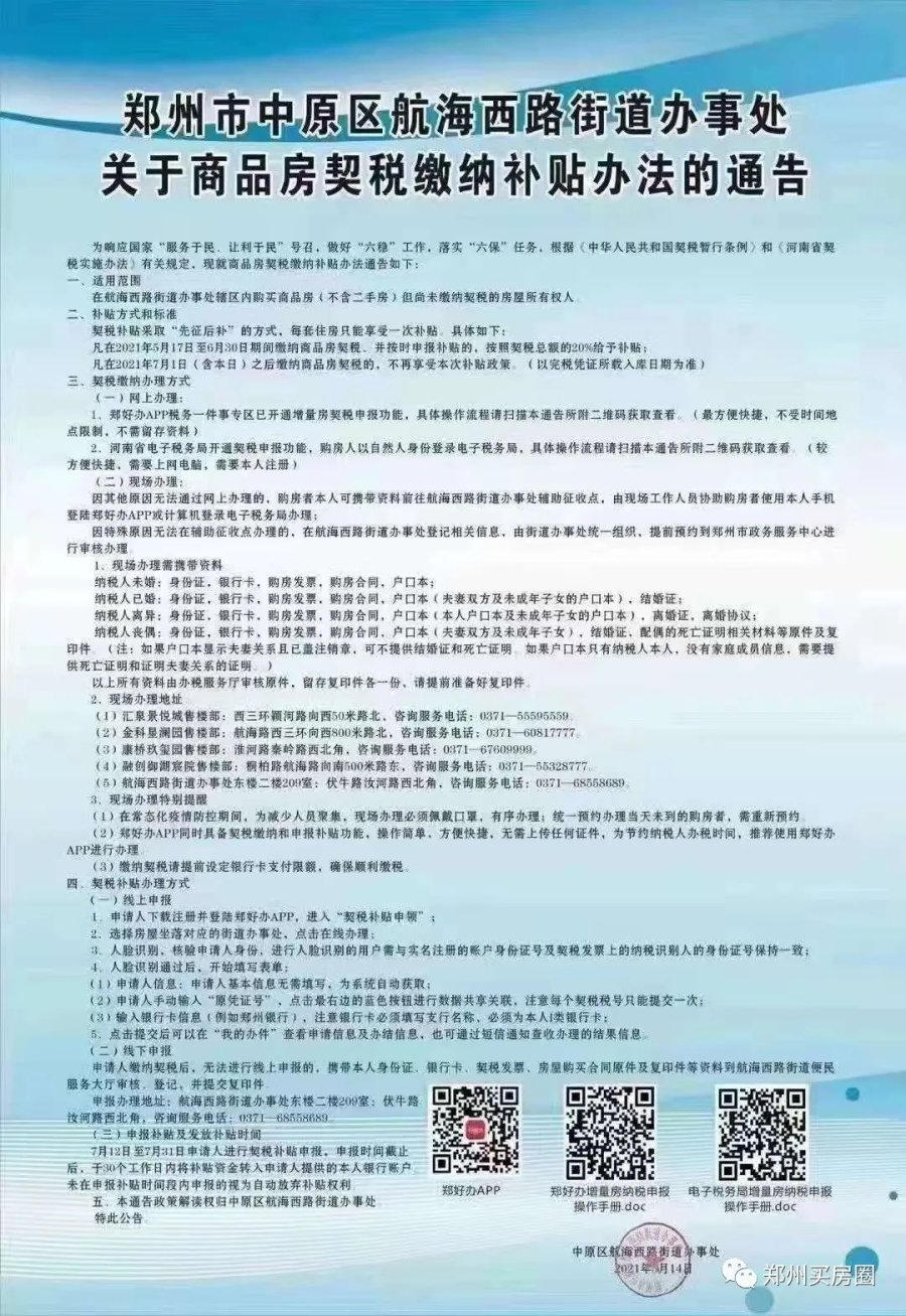 近日,网传郑州一些区域将推行新一轮契税补贴,究竟是否属实呢?经调查发现,郑州的确有不少办事处已经开始实行新一轮契税补贴,额度达到20%。会不会有更多地方跟进呢?网上流传的照片显示,郑州航海西路办事处发布了一份《郑州市中原区航海西路街道办事处关于商品房契税缴纳补贴办法的通知》(下简称《通知》)。5月17日下午,记者在航海西路办事处一间办公室门口,看到了这份《通知》以及配套的契税缴纳、补贴申报等流程示意。航海西路街道办事处工作人员告诉河南商报记者,目前该办事处的确推出了契税补贴政策,具体政策以《通知》为准。《通知》显示,契税补贴使用范围是在航海西路街道办事处辖区内购买商品房(不含二手房),但尚未缴纳契税的房屋所有权人“主要针对新房,二手房不享受补贴。”航海西路街道办事处工作人员称,只要是新房,无论是住宅、商铺、公寓都能享受契税补贴。至于补贴幅度,《通知》显示,凡在2021年5月17日至6月30日期间缴纳商品房契税,并按时申报补贴的,按照契税总额的20%给予补贴。7月1日(含本日)之后缴纳商品房契税的,不再享受本次补贴政策。(以完税凭证所载入库日期为准。)记者了解到,除航海西路街道办事处外,郑州多个办事处近期推出契税补贴政策。