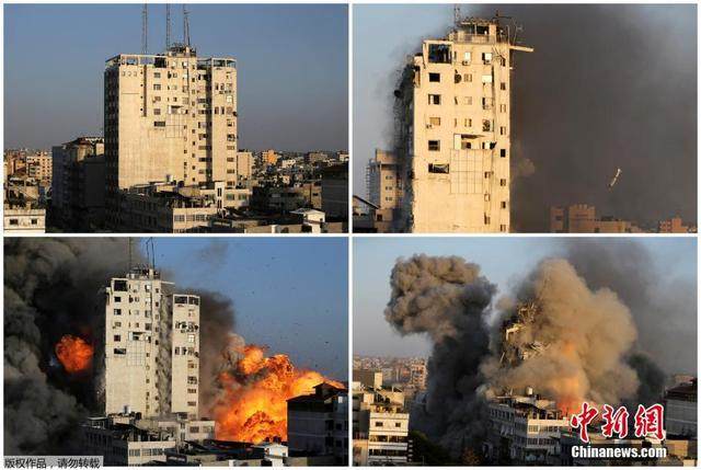当地时间5月12日,在以色列对加沙市实施的空袭中,一枚导弹降落在一座塔楼上,这栋高层建筑瞬间坍塌“消失”在楼群之中。
