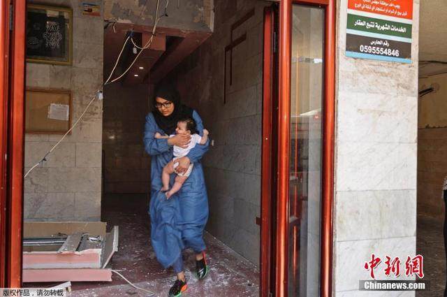 当地时间5月11日,加沙地区,一名带着孩子的巴勒斯坦妇女撤离建筑物。