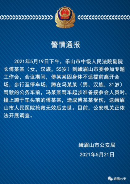 峨眉公安5月21日下午发布警情通报:2021年5月19日下午,乐山市中级人民法院副院长傅某某(女.汉族,55岁)到峨眉山市委参加专题工作会,会议期间,傅某某因身体不适提前离开会场,步行至停车场,蹲在冯某某(男,汉族,31 岁)驾驶的公务车前。冯某某驾车起步准备接参会人员时,撞上蹲于车头前的傅某某,造成傅某某受伤,送峨眉山市人民医院抢救无效后去世。目前,公安机关正依法开展调查。