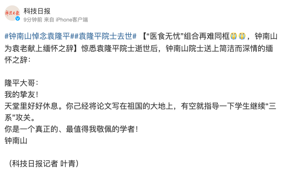 (原标题《“医食无忧”组合再难同框,钟南山为袁老献上缅怀之辞》)
