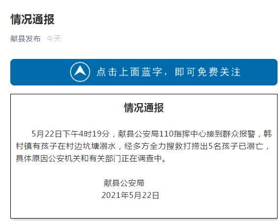 5月22日下午4时19分,献县公安局110指挥中心接到群众报警,韩村镇有孩子在村边坑塘溺水,经多方全力搜救打捞出5名孩子已溺亡,具体原因公安机关和有关部门正在调查中。