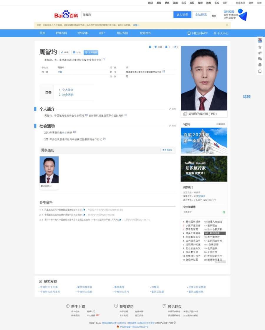 在百科信息里,周智均还冒充过“中国道路运输协会专家顾问”“首都新机场建设领导小组副局长”,可谓人有多大胆,头衔就有多长。这种涉及国家机关、事业单位的重要信息,百度百科有无进行审核,以致于堂而皇之地出现在了词条里?