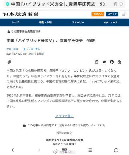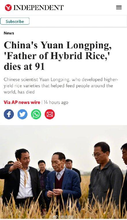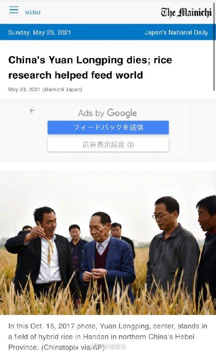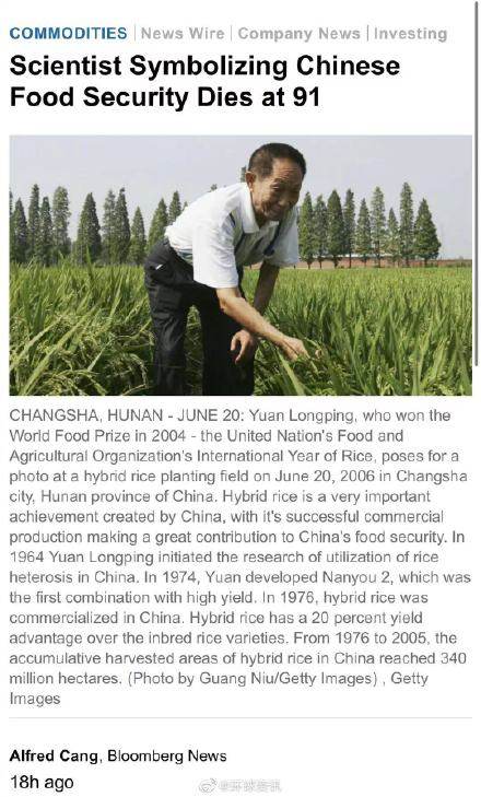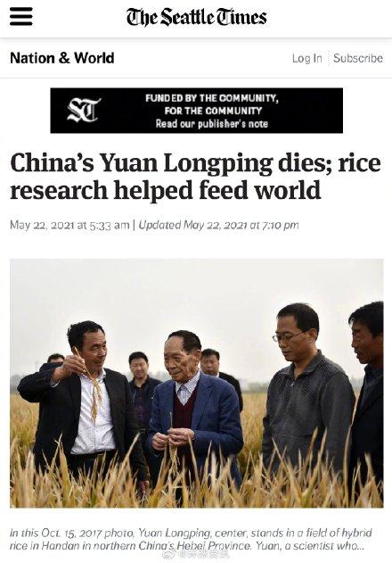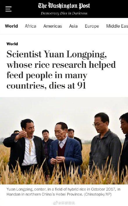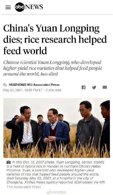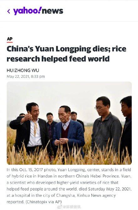 5月22日13时07分,“杂交水稻之父”、中国工程院院士、“共和国勋章”获得者袁隆平逝世,享年91岁。美联社、日本经济新闻等均报道了此消息↓↓↓