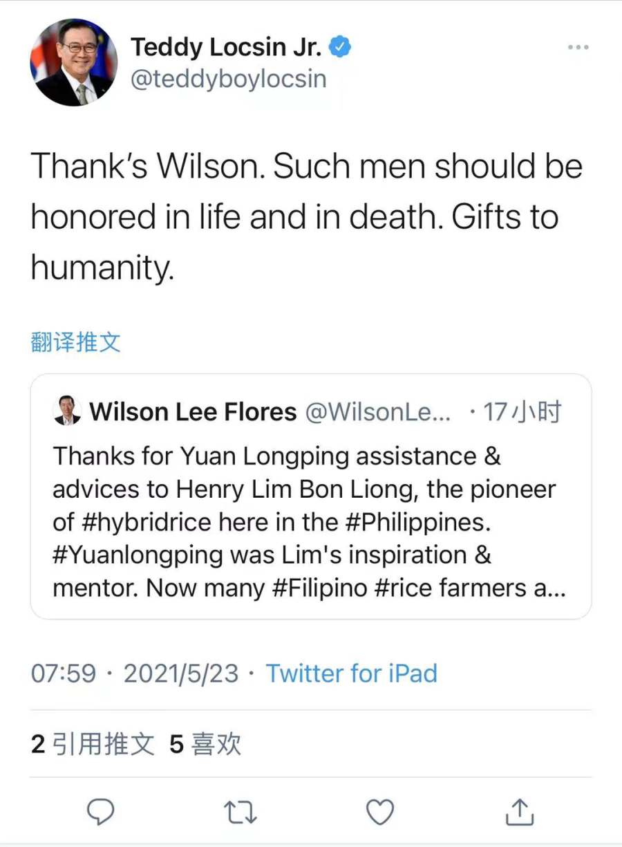 5月22日,菲律宾专栏作家李天荣在社交媒体上发文致敬袁隆平。李天荣称菲律宾的“水稻大王”林育庆得益于袁隆平的指导,菲律宾众多稻农也因杂交水稻技术而获益。