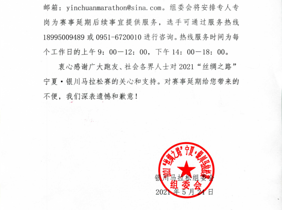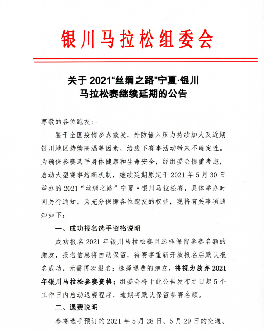 2021“丝绸之路”宁夏•银川马拉松赛组委会发布公告称,鉴于全国疫情多点散发,外防输入压力持续加大及近期银川地区持续高温等因素,给线下赛事活动带来不确定性,为确保参赛选手身体健康和生命安全,经组委会慎重考虑,启动大型赛事熔断机制,继续延期原定于5月30日举办的2021“丝绸之路”宁夏•银川马拉松赛,具体举办时间另行通知。