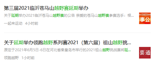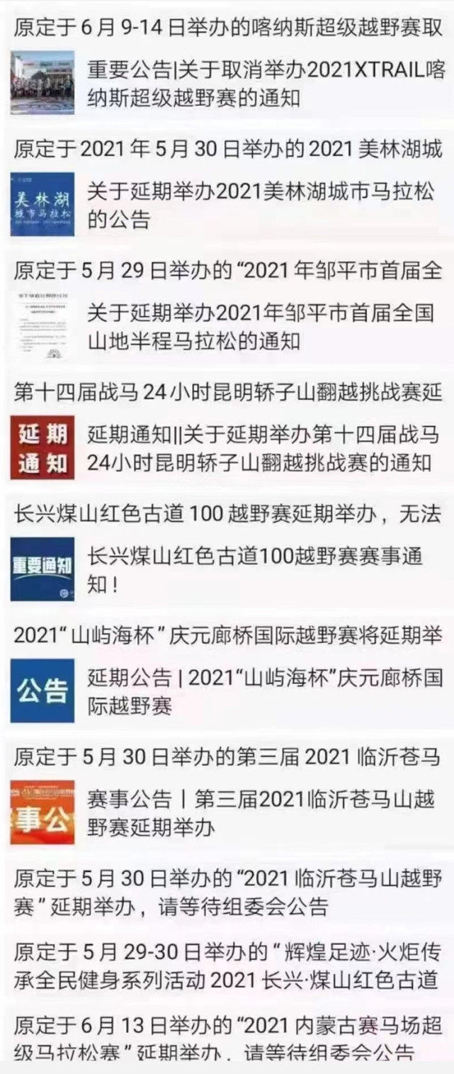 5月30日举办的美林湖城市马拉松赛、5月29日举办的邹平市首届全国山地半程马拉松、6月13日举办的2021内蒙古赛马场超级马拉松赛等比赛都有相关取消或者延期的消息。