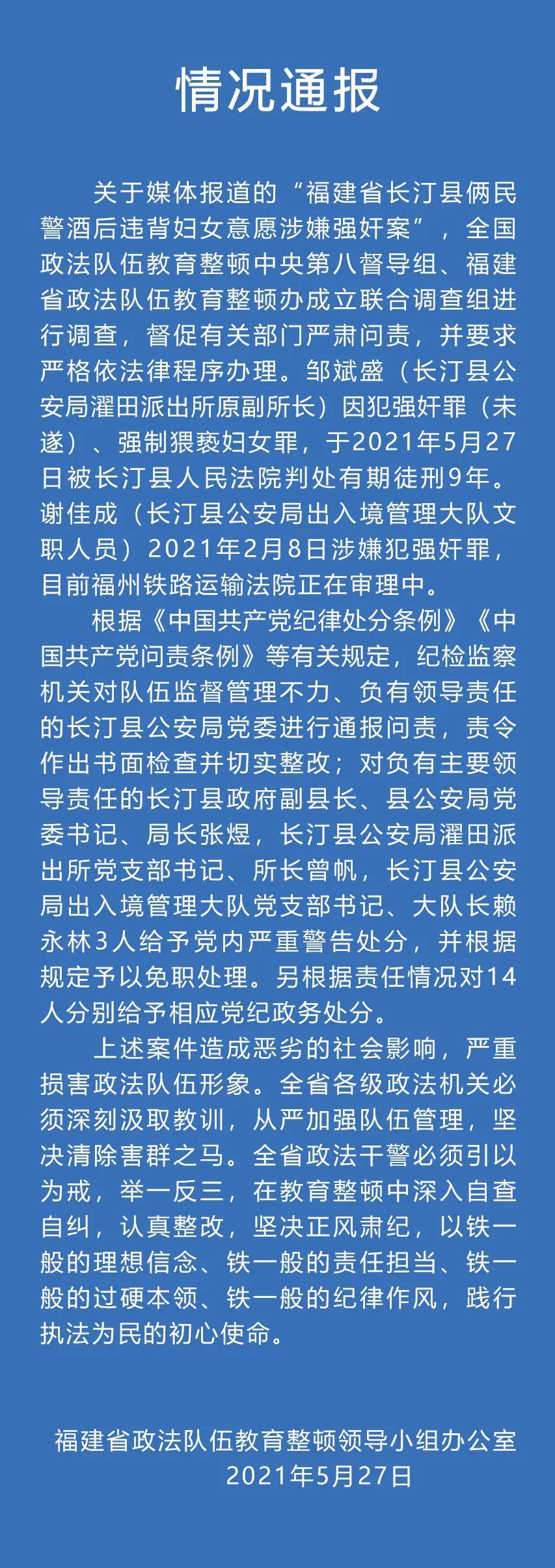 4月19日,福建省政法队伍教育整顿办通报称:由全国政法队伍教育整顿第八督导组、福建省政法队伍教育整顿办成立联合调查组,对媒体报道的“福建省长汀县俩民警酒后违背妇女意愿涉嫌强奸”开展调查。