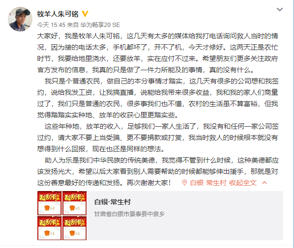 新浪微博认证用户@牧羊人朱可铭 发文称:大家好,我是牧羊人朱可铭,这几天有太多的媒体给我打电话询问救人当时的情况,因为接的电话太多,手机都坏了,开不了机,今天才修好。这两天正是农忙时节,我要给地里浇水,还要放羊,实在应付不过来。希望朋友们更多关注政府官方发布的信息,我真的只是做了一件力所能及的事情,真的没有什么。