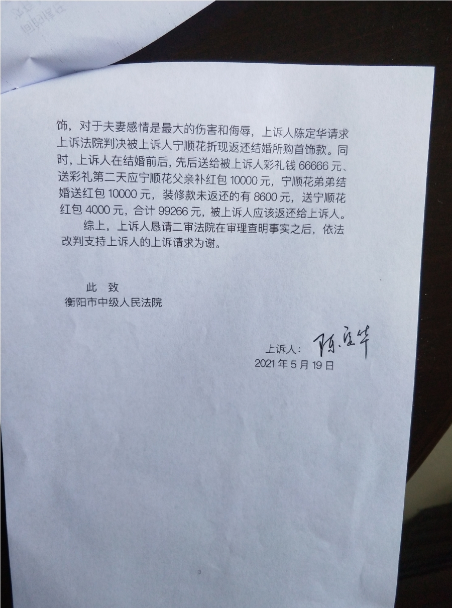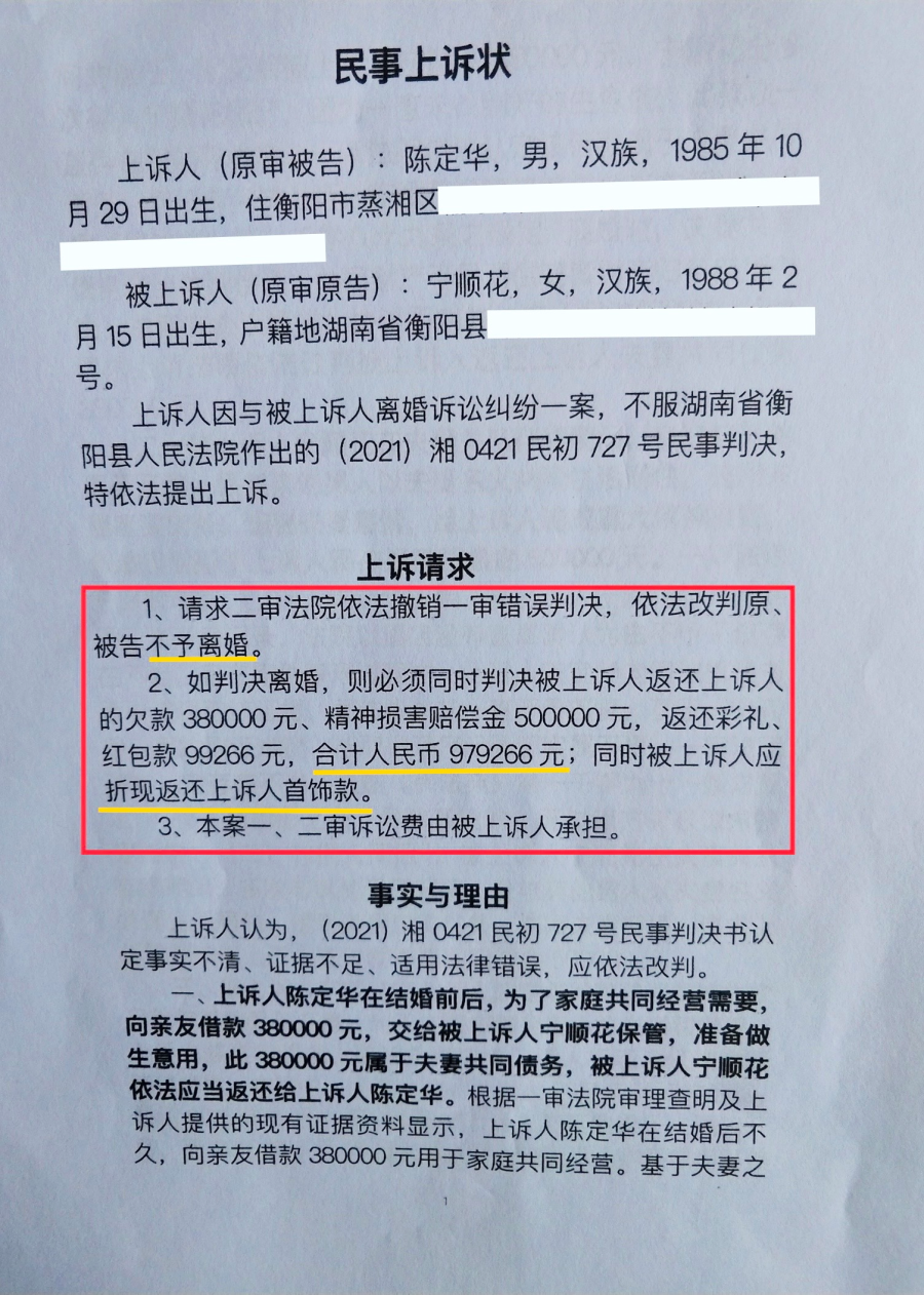 5月28日上午,正观新闻记者从5年5诉离婚案当事人律师曹远泽处了解到,男方陈定华已于5月19日提起上诉,请求二审法院依法撤销一审错误判决,依法改判原、被告不予离婚。如判决离婚,则必须同时判决被上诉人返还上诉人欠款38万元、精神损害赔偿金50万元,返还彩礼、红包款99266元,总计979266元。