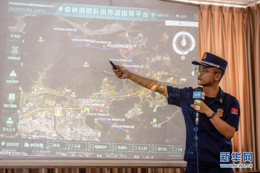 5月28日,工作人员介绍15头野象在云南省玉溪市峨山县境内的迁移路线。新华社记者 胡超 摄