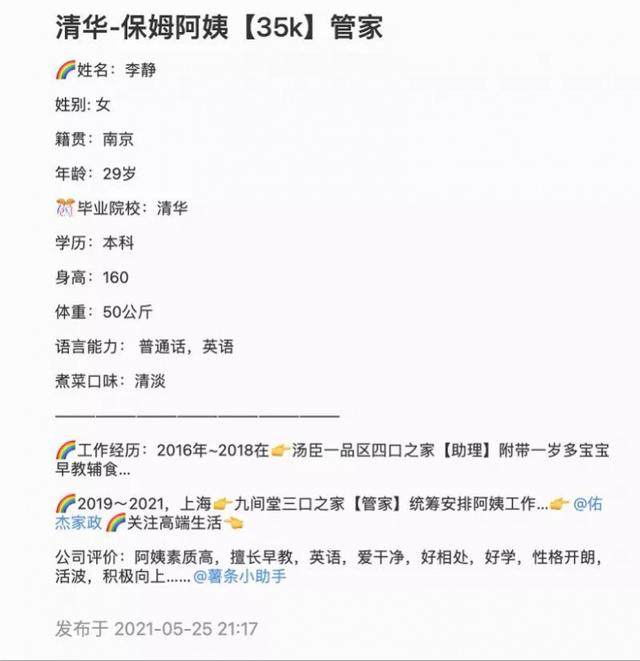 近年来,不少大城市都出现了高学历保姆。今年年初,杭州曾经报道过“硕士毕业生2万元月薪应聘保姆”的新闻。值得注意的是,此前不少高学历人员以零工作经验应聘高薪保姆,而此次这位清华毕业的保姆已经在两个家庭担任过助理和管家。由此可见,她的高薪恐怕并非单纯因为高学历,更有可能是她在能力上契合了高端家政服务的需求。此外,她独特的职业规划发展路径,也为大学生的“新就业观”提供了鲜活范例。