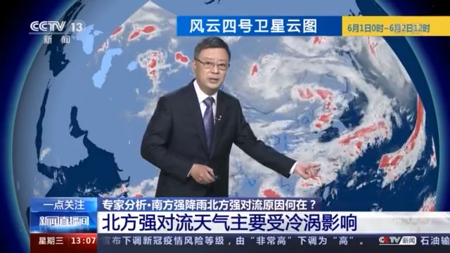 中国气象局气象服务首席专家 朱定真:近两天,南北方都出现了比较明显的强对流天气和强降水,如果说我们从整个的天气系统看,实际上是两个天气系统在发挥作用。