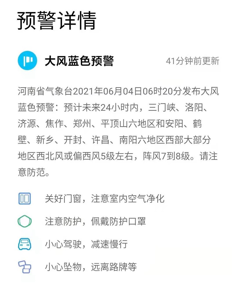 河南省气象台2021年06月04日06时20分发布大风蓝色预警:预计未来24小时内,三门峡、洛阳、济源、焦作、郑州、平顶山六地区和安阳、鹤壁、新乡、开封、许昌、南阳六地区西部大部分地区西北风或偏西风5级左右,阵风7到8级。请注意防范。