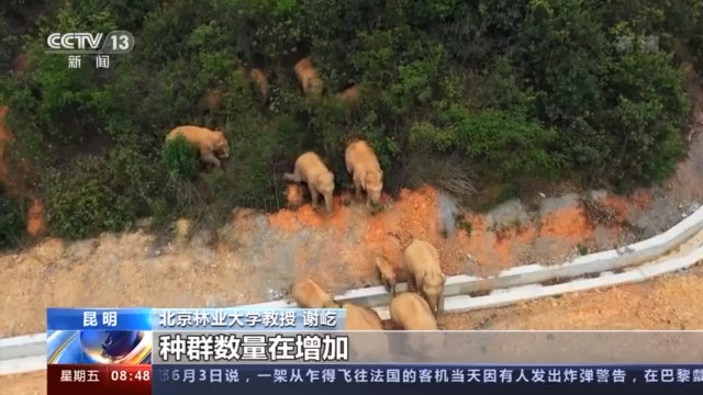 北京林业大学教授 谢屹:大象北迁是一个很严肃、很专业的科学问题。目前已知的大象栖息地的数量还是既定的,但大象的种群由于我们保护力度得力,种群数量在增加,原来的食物生存空间就不能满足它了。举个例子,同一个区域的三个象群,他们的食物可能完全不一样。