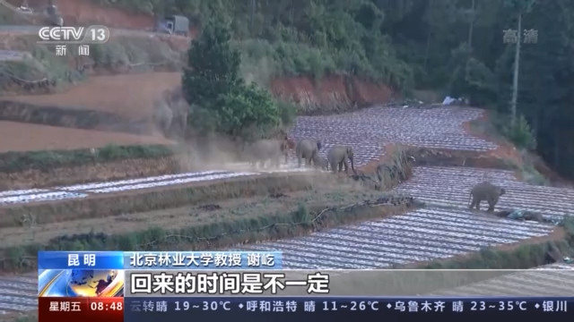 北京林业大学教授 谢屹:在(西双)版纳的野象谷这个地区,有三群象。这三群象都会有些移动,它不会在一个地方。从(西双)版纳北移到普洱,有些象群会回来,回来的时间不一定,有的时间长,有的时间短,现在说大象会不会一直北迁,现在下定论还为时过早。