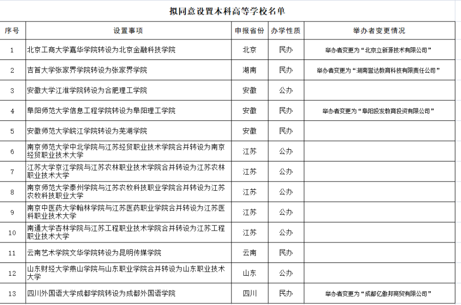 6月4日,教育部网站发布关于拟同意设置本科高等学校的公示。