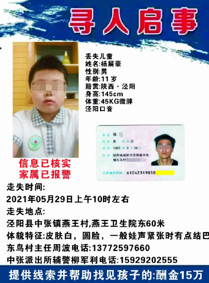 这几日,咸阳泾阳县11岁男童杨展豪的照片在朋友圈刷屏,从5月29日和爸爸从泾阳县城回到了东鸟村的家离奇失踪后,家人和村民都在努力寻找他。