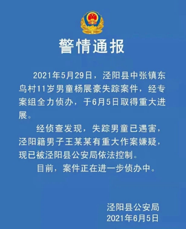 6月5日下午2点多,在杨展豪离奇失踪1周后传来噩耗,据泾阳县公安局警情通报显示:经侦查发现,失踪男童已遇害,泾阳籍男子王某某有重大作案嫌疑,现已被泾阳县公安局依法控制。