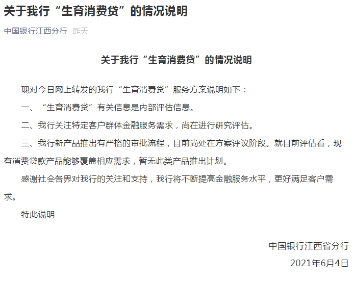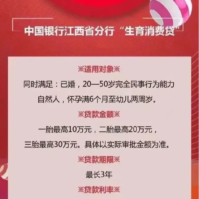 “一胎最高(贷款)10万元,二胎最高20万元,三胎最高30万元。”6月3日前后,网络上开始流传一张关于中国银行江西省分行“生育消费贷”的宣传海报。