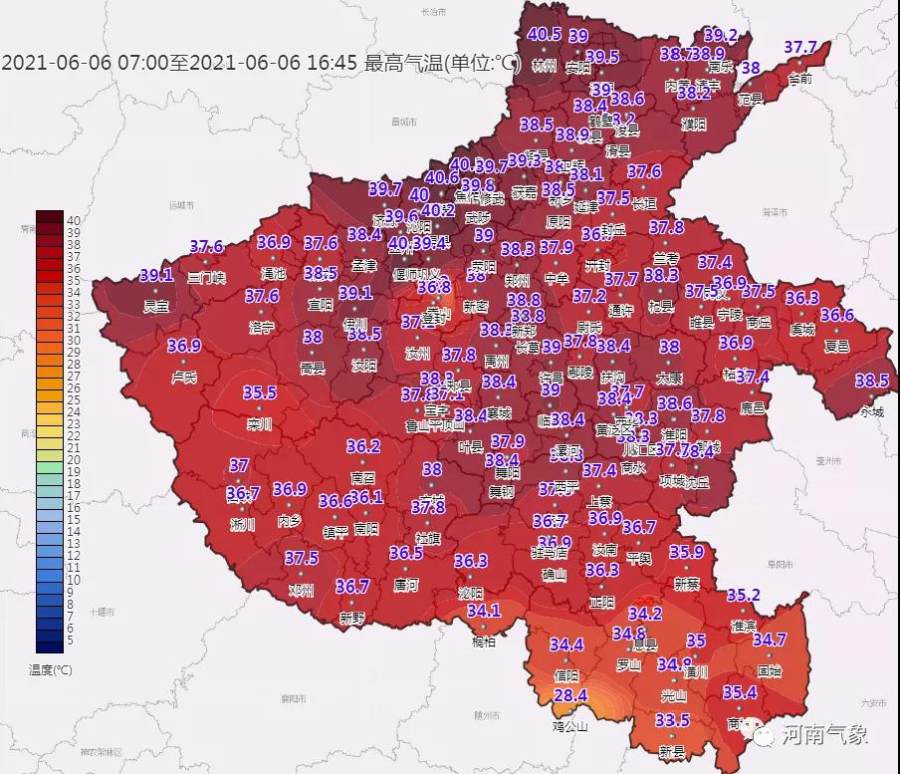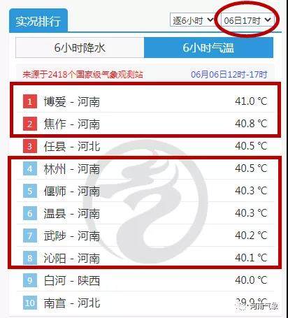 截止到6月6日下午17时来看,河南7个站点气温达到了40℃,博爱以41℃高居全国高温榜“NO.1”。