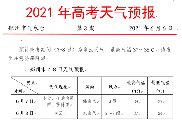 6月6日下午,记者从郑州气象局获悉,预计高考期间(7-8日)郑州为多云天气,最高气温37~38℃。请考生注意防暑降温。